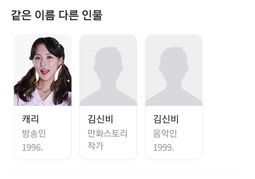 같은 이름, 다른 인물 첫 번째로 캐리 김신비가 검색이 됨.