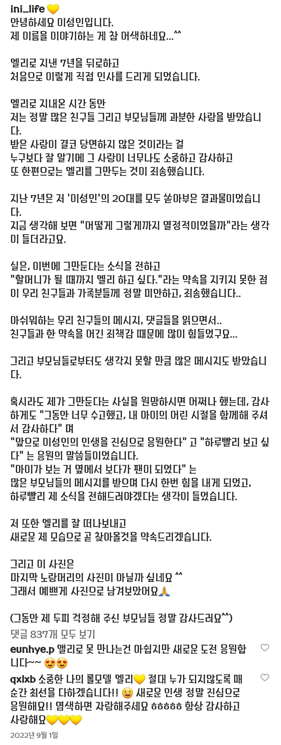 자신의 인스타그램에 마지막 인사를 남기며 이별을 전하기도 했었음.(댓글의 qxlxb가 2대 엘리 김명현)